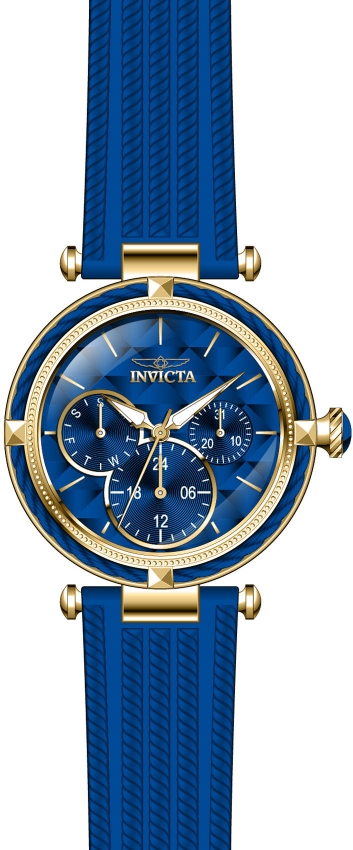 Gold-tone stainless steel case with a blue polyurethane strap. Fixed blue stainless steel bezel. Blue dial with gold-tone alpha-style shape hands and index hour markers. Dial Type: Analog. Luminescent hands. Date display at the 3 o'clock position. Three - 24 hour, date and day of the week subdials. TMI Caliber VH63 quartz movement. Scratch resistant flame fusion crystal. Pull / push crown. Solid case back. Round case shape. Case size: 36 mm. Band width: 18 mm, band length: 7.75 inches. Buckle clasp. Water resistant at 100 meters / 330 feet. Functions: date, day, GMT, second time zone, hour, minute, second. Sport watch style. Watch label: Japan Movt. Invicta Bolt Blue Dial Alpha Ladies Watch 28968.