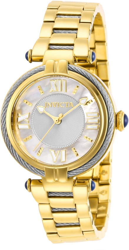 Gold-tone stainless steel case with a two-tone (silver-tone and gold-tone) stainless steel bracelet. Fixed two-tone (silver-tone and gold-tone) stainless steel bezel. White dial with gold-tone hands and Roman numeral and index hour markers. Dial Type: Analog. Luminescent hands and markers. TMI Caliber PC21J quartz movement. Scratch resistant flame fusion crystal. Pull / push crown. Solid case back. Round case shape, case size: 32 mm, case thickness: 10.2 mm. Band width: 16 mm, band length: 7 inches. Fold over clasp. Water resistant at 50 meters / 165 feet. Functions: hour, minute, second. Casual watch style. Watch label: Japan Movt. Invicta Bolt Quartz White Dial Ladies Watch 29130.