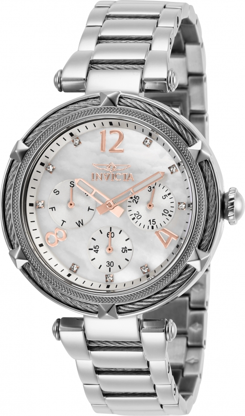 Stainless steel case with a stainless steel bracelet with silver-tone cable wire inserts. Fixed stainless steel bezel with silver-tone cable wire trim. White mother of pearl dial with luminous rose gold-tone hands and crystal hour markers. Arabic numerals mark the 4, 8 and 12 o'clock positions. Minute markers around the outer rim. Dial Type: Analog. Luminescent hands. Date display at the 3 o'clock position. Three multi-function sub-dials displaying: date, day of the week and small second. Hattori caliber VD75 quartz movement. Scratch resistant flame fusion crystal. Pull / push crown. Solid case back. Round case shape. Case size: 38 mm. Case thickness: 9.2 mm. Band width: 18.50 mm, band length: 7.5 inches. Butterfly clasp. Water resistant at 50 meters / 165 feet. Functions: date, day, hour, minute, small second. Bolt Series. Dress watch style. Watch label: Japan Movt. Invicta Bolt Quartz Crystal White Dial Ladies Watch 29133.