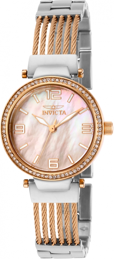 Stainless steel case with a stainless steel bracelet with rose gold-tone cable wire inserts. Fixed rose gold-tone bezel set with crystals. White mother of pearl dial with luminous rose gold-tone hands and index hour markers. Arabic numerals mark the 3, 6, 9 and 12 o'clock positions. Dial Type: Analog. Luminescent hands and markers. TMI caliber PC21J quartz movement. Scratch resistant flame fusion crystal. Pull / push crown. Solid case back. Round case shape. Case size: 30 mm. Case thickness: 9.3 mm. Band width: 15 mm. Band length: 7 inches. Jewelry clasp. Water resistant at 50 meters / 165 feet. Functions: hour, minute, second. Bolt Series. Casual watch style. Watch label: Japan Movt. Invicta Bolt Quartz Crystal Mother of Pearl Dial Ladies Watch 29142.