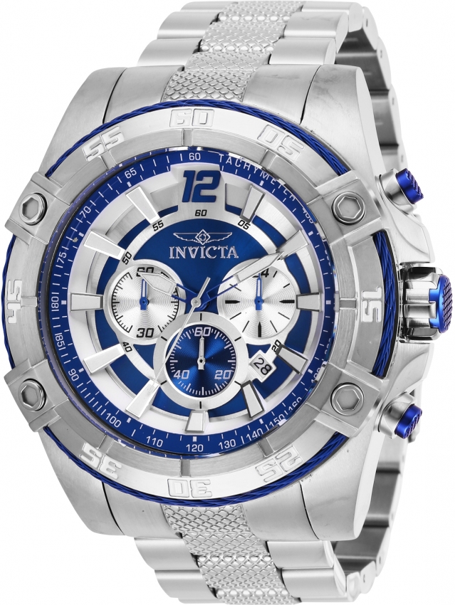 Silver-tone stainless steel case with a silver-tone stainless steel bracelet. Silver and blue stainless steel and cable bezel. Blue dial with silver-tone hands and Arabic numeral and index hour markers. Tachymeter scale around the outer rim. Dial Type: Analog. Luminescent hands and markers. Date display between 4 and 5 o'clock position. Chronograph - three sub-dials displaying: 60 second, 60 minute and 24 hour. Hattori Caliber VD53 quartz movement. Scratch resistant flame fusion crystal. Pull / push crown. Solid case back. Round case shape, case size: 52 mm, case thickness: 18 mm. Band width: 26 mm, band length: 7 inches. Fold over clasp. Water resistant at 100 meters / 330 feet. Functions: chronograph, date, GMT, second time zone, hour, minute, second. Sport watch style. Watch label: Japan Movt. Invicta Bolt Chronograph Quartz Blue Dial Mens Watch 29290.