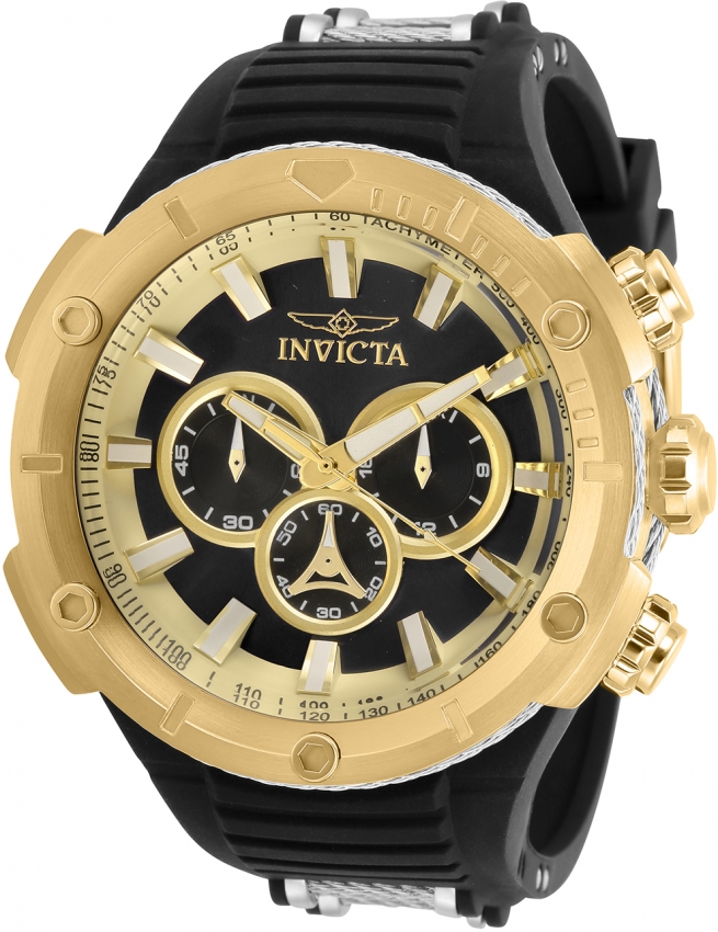 Stainless steel case with a black silicone (polyurethane) strap with silver-tone cable wire inserts. Fixed yellow gold-tone bezel with silver-tone cable wire trim. Black dial with luminous yellow gold-tone hands and index hour markers. Tachymeter markers around the outer rim. Dial Type: Analog. Luminescent hands and markers. Chronograph - three sub-dials displaying: 60 second, 60 minute and 24 hour. Hattori caliber VD54 quartz movement. Scratch resistant flame fusion crystal. Pull / push crown. Solid case back. Round case shape. Case size: 52 mm. Case thickness: 17 mm. Band width: 45 mm. Band length: 9 inches. Tang clasp. Water resistant at 100 meters / 330 feet. Functions: chronograph, GMT, second time zone, hour, minute, second. Bolt Series. Sport watch style. Watch label: Japan Movt. Invicta Bolt Chronograph Quartz Black Dial Mens Watch 29596.