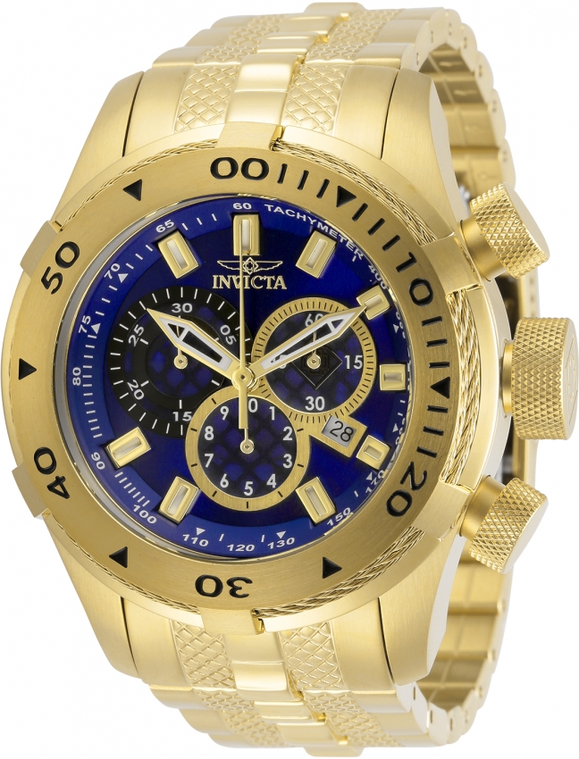 Yellow gold-tone stainless steel case and bracelet. Uni-directional rotating yellow gold-tone bezel with gold-tone cable wire trim. Blue dial with yellow gold-tone skeleton hands and index hour markers. Tachymeter markers around the outer rim. Dial Type: Analog. Luminescent hands and markers. Date display at the 4 o'clock position. Chronograph - three sub-dials displaying: 60 second, 30 minute and 1/10th of a second. Ronda caliber 5040.D quartz movement. Scratch resistant mineral crystal. Pull / push crown. Solid case back. Round case shape. Case size: 50 mm. Case thickness: 19 mm. Band width: 26 mm. Band length: 8.25 inches. Fold over clasp with a safety release. Water resistant at 200 meters / 660 feet. Functions: chronograph, big date, hour, minute, small second. Bolt Series. Sport watch style. Watch label: Swiss Movt. Invicta Bolt Chronograph Quartz Blue Dial Mens Watch 29746.