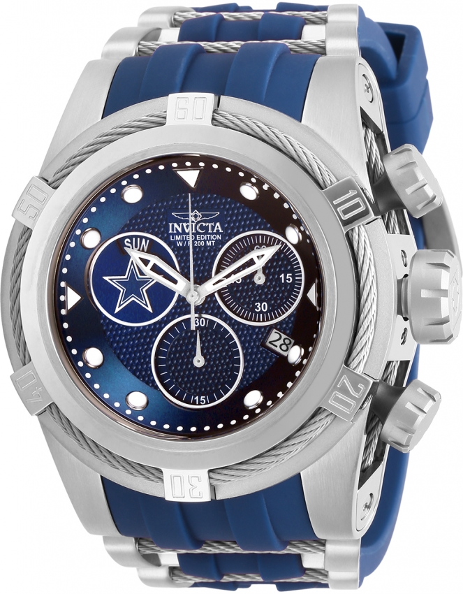 Stainless steel case with a blue silicone strap with stainless steel accents. Uni-directional rotating stainless steel bezel with cable wire trim. Navy blue dial with silver-tone skeleton hands and dot hour markers. Minute markers around the outer rim. Dial Type: Analog. Luminescent hands and markers. Date display at the 4 o'clock position. Chronograph - two sub-dials displaying: 60 second and 30 minute. Day of the week display. Ronda caliber Z60 quartz movement. Scratch resistant mineral crystal. Screw down crown. Solid case back. Round case shape. Case size: 53 mm. Case thickness: 21 mm. Band width: 35 mm. Band length: 8.25 inches. Tang clasp. Water resistant at 200 meters / 660 feet. Functions: chronograph, date, day, hour, minute, small second. Sport watch style. Watch label: Swiss Movt. Invicta Bolt Chronograph Quartz Navy Blue Dial Mens Watch 30231.