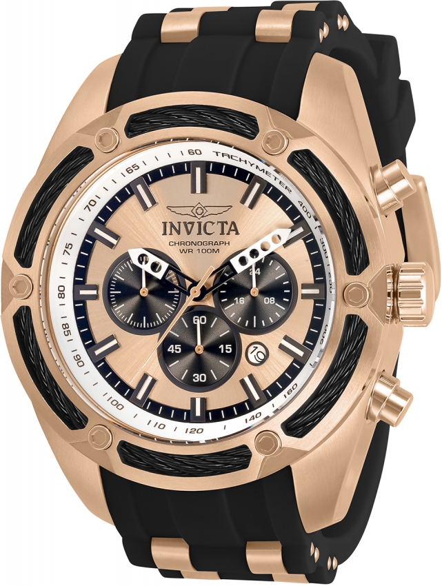 Rose gold-tone stainless steel case with a two-tone (rose gold-tone and black) stainless steel and polyurethane strap. Fixed black and rose gold stainless steel and cable bezel. Rose gold-tone dial with skeleton hands and index hour markers. Tachymeter scale around the outer rim. Dial Type: Analog. Luminescent hands and markers. Date display between 4 and 5 o'clock position. Chronograph - three sub-dials displaying: 60 second, 60 minute and 24 hour. Hattori Caliber VD53 quartz movement. Scratch resistant flame fusion crystal. Pull / push crown. Solid case back. Round case shape. Case size: 52 mm. Band width: 26 mm, band length: 8.25 inches. Buckle clasp. Water resistant at 100 meters / 330 feet. Functions: chronograph, date, GMT, second time zone, hour, minute, second. Sport watch style. Watch label: Japan Movt. Invicta Bolt Chronograph Quartz Rose Gold Dial Mens Watch 31066.