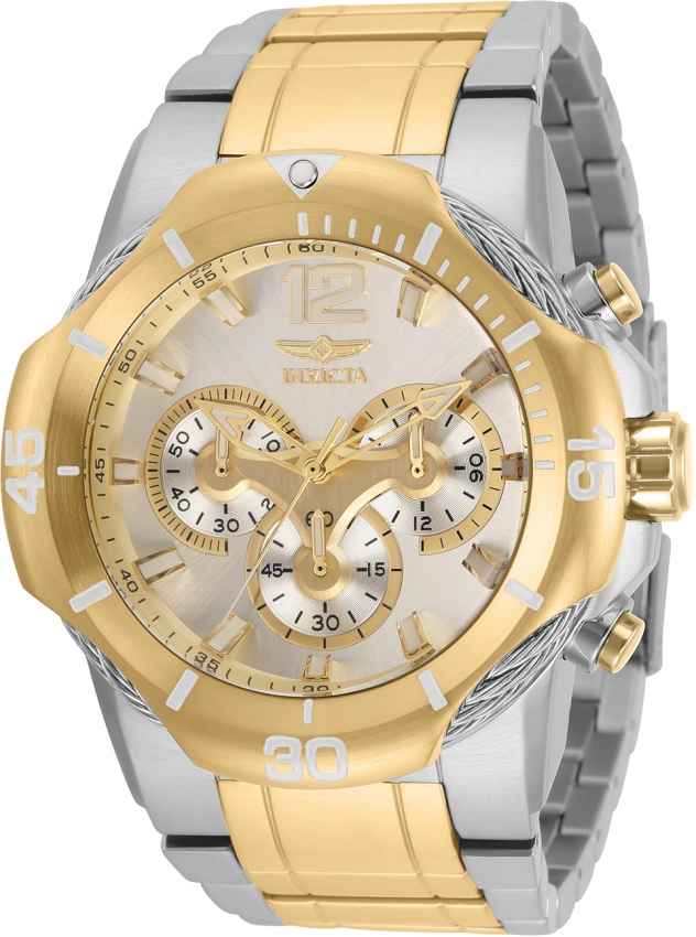 Stainless steel case with a two-tone (silver-tone and yellow gold-tone) stainless steel bracelet. Fixed yellow gold-tone bezel with silver-tone cable wire trim. White dial with luminous yellow gold-tone hands and index hour markers. An Arabic numeral appears at the 12 o'clock position. Minute markers around the outer rim. Dial Type: Analog. Luminescent hands and markers. Chronograph - three sub-dials displaying: 60 second, 60 minute and 24 hour. Hattori caliber VD54 quartz movement. Scratch resistant Flame Fusion crystal. Pull / push crown. Solid case back. Round case shape. Case size: 51 mm. Case thickness: 12 mm. Band width: 30 mm. Band length: 7.25 inches. Fold over clasp with a safety release. Water resistant at 100 meters / 330 feet. Functions: chronograph, GMT, second time zone, hour, minute, second. Bolt Series. Sport watch style. Watch label: Japan Movt. Invicta Bolt Chronograph Quartz White Dial Mens Watch 31163.