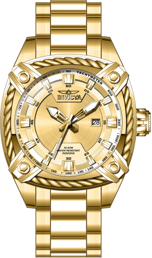 Gold-tone stainless steel case with a gold-tone stainless steel bracelet. Fixed gold-tone stainless steel and cable bezel. Gold-tone dial with gold-tone hands and index hour markers. Tachymeter scale around the outer rim. Dial Type: Analog. Luminescent hands and markers. Date display at the 3 o'clock position. Hattori Calibre VJ42 quartz movement. Scratch resistant flame fusion crystal. Pull / push crown. Solid case back. Cushion case shape, case size: 50 mm, case thickness: 19 mm. Band width: 24 mm, band length: 7.25 inches. Fold over clasp. Water resistant at 100 meters / 330 feet. Functions: date, hour, minute, second. Casual watch style. Watch label: Japan Movt. Invicta Bolt Quartz Gold Dial Cable Bezel Mens Watch 31385.