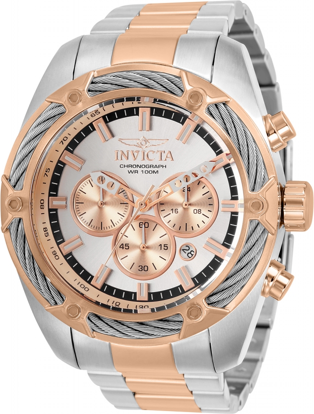 Silver-tone stainless steel case with a rose gold and silver stainless steel bracelet. Uni-directional rotating silver and rose gold stainless steel and cable bezel. Silver-tone dial with rose gold-tone hands and index hour markers. Tachymeter scale around the outer rim. Dial Type: Analog. Luminescent hands and markers. Date display between 4 and 5 o'clock position. Chronograph - three sub-dials displaying: 60 second, 60 minute and 24 hour. Hattori Caliber VD53 quartz movement. Scratch resistant flame fusion crystal. Pull / push crown. Solid case back. Round case shape, case size: 52 mm, case thickness: 21.1 mm. Band width: 26 mm, band length: 7.25 inches. Fold over clasp. Water resistant at 100 meters / 330 feet. Functions: chronograph, date, GMT, second time zone, hour, minute, second. Sport watch style. Watch label: Japan Movt. Invicta Bolt Chronograph Quartz Silver Dial Mens Watch 31438.