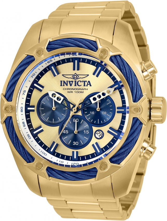Gold-tone stainless steel case with a gold-tone stainless steel bracelet. Fixed blue and gold stainless steel and cable bezel. Gold-tone dial with blue and white hands and index hour markers. Tachymeter scale around the outer rim. Dial Type: Analog. Luminescent hands and markers. Date display between 4 and 5 o'clock position. Chronograph - three sub-dials displaying: 60 second, 60 minute and 24 hour. Hattori Caliber VD53 quartz movement. Scratch resistant flame fusion crystal. Pull / push crown. Solid case back. Round case shape, case size: 52 mm, case thickness: 21.1 mm. Band width: 26 mm, band length: 7.25 inches. Fold over clasp. Water resistant at 100 meters / 330 feet. Functions: chronograph, date, GMT, second time zone, hour, minute, second. Sport watch style. Watch label: Japan Movt. Invicta Bolt Chronograph Quartz Gold Dial Mens Watch 31441.