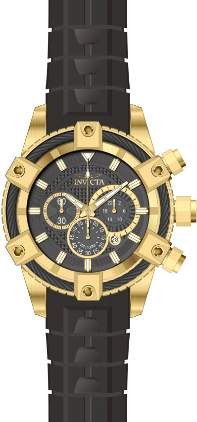 Gold-tone stainless steel case with a black polyurethane bracelet. Uni-directional rotating gold-tone and black stainless steel cable bezel. Black dial with gold-tone hands and index hour markers. Dial Type: Analog. Luminescent hands and markers. Date display between 4 and 5 o'clock position. Chronograph - three sub-dials displaying: 60 second, 60 minute and 24 hour. Hattori Caliber VD53 quartz movement. Scratch resistant flame fusion crystal. Pull / push crown. Solid case back. Round case shape, case size: 48 mm, case thickness: 17 mm. Band width: 24 mm, band length: 8.5 inches. Buckle clasp. Water resistant at 100 meters / 330 feet. Functions: chronograph, date, GMT, second time zone, hour, minute, second. Sport watch style. Watch label: Japan Movt. Invicta Bolt Chronograph Black Dial Mens Watch 90270.
