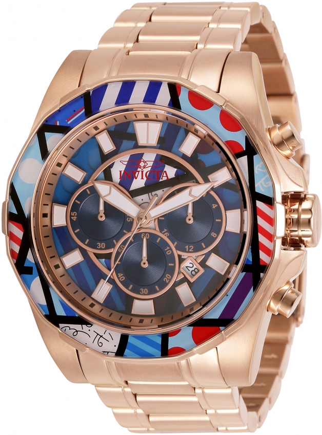 Rose gold-tone stainless steel case with a rose gold-tone stainless steel bracelet. Fixed blue and red and purple and white and black and rose gold stainless steel bezel. Blue and purple and white and red dial with gold-tone hands and index hour markers. Minute markers around the outer rim. Dial Type: Analog. Luminescent hands and markers. Date display between 4 and 5 o'clock position. Chronograph - three sub-dials displaying: 60 second, 60 minute and 24 hour. Hattori Caliber VD53 quartz movement. Scratch resistant flame fusion crystal. Pull / push crown. Solid case back. Round case shape. Case size: 48 mm. Band width: 26 mm, band length: 7.25 inches. Fold over clasp. Water resistant at 100 meters / 330 feet. Functions: chronograph, date, GMT, second time zone, hour, minute, second. Sport watch style. Watch label: Japan Movt. Invicta Britto Chronograph Quartz Mens Watch 32401.