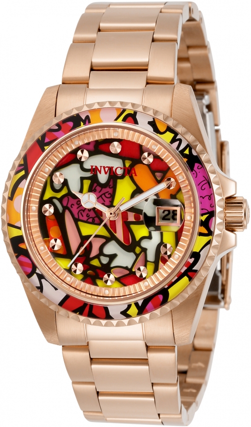 Rose gold-tone stainless steel case with a rose gold-tone stainless steel bracelet. Fixed red and purple and white and black stainless steel bezel. Purple and white and red and yellow and orange and dial with rose gold-tone Mercedes-logo, sword, and Breguet-style shape hands and dot hour markers. Minute markers around the outer rim. Dial Type: Analog. Luminescent hands. Date display at the 3 o'clock position. Hattori Caliber PC32 quartz movement. Scratch resistant flame fusion crystal. Pull / push crown. Solid case back. Round case shape. Case size: 38 mm. Band width: 20 mm, band length: 7 inches. Fold over clasp. Water resistant at 100 meters / 330 feet. Functions: date, hour, minute, second. Casual watch style. Watch label: Japan Movt. Invicta Britto Quartz Ladies Watch 32411.