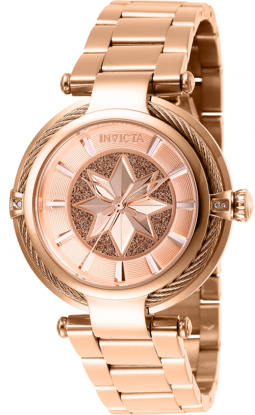 Rose gold-tone stainless steel case with a rose gold-tone stainless steel bracelet. Fixed rose gold-tone stainless steel and cable bezel. Rose gold-tone dial with rose gold-tone hands and index hour markers. Dial Type: Analog. TMI Caliber PC21J quartz movement. Scratch resistant flame fusion crystal. Pull / push crown. Solid case back. Round case shape, case size: 40 mm, case thickness: 12.5 mm. Band width: 20 mm, band length: 7 inches. Fold over clasp. Water resistant at 100 meters / 330 feet. Functions: hour, minute, second. Casual watch style. Watch label: Japan Movt. Invicta Captain Marvel Quartz Rose Gold Dial Ladies Watch 28834.
