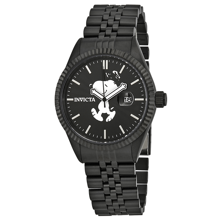 Black ion-plated stainless steel case with a black ion-plated stainless steel bracelet. Fixed fluted black ion-plated stainless steel bezel. Black (snoopy) dial with luminous hands and diamond hour markers. Minute markers around the outer rim. Dial Type: Analog. Date display at the 3 o'clock position. Hattori Caliber PC32A quartz movement. Scratch resistant mineral crystal. Pull / push crown. Solid case back. Round case shape, case size: 43 mm, case thickness: 12 mm. Band width: 20 mm, band length: 8.25 inches. Fold over clasp. Water resistant at 50 meters / 165 feet. Functions: date, hour, minute, second. Casual watch style. Watch label: Japan Movt. Invicta Character Collection Snoopy Diamond Black Dial Mens Watch 24802.