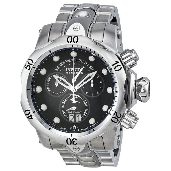 Silver-tone stainless steel case with a two: stainless steel and black polyurethane strap. Uni-directional ratcheting silver-tone stainless steel bezel. Black dial with silver-tone hands and dots hour markers. Minute markers around the outer rim. Dial Type: Analog. Luminescent hands and markers. Date display at the 6 o'clock position. Four sub-dials displaying: 60 second, 30 minute and 1/10th of a second and retrograde day. Ronda Caliber 8040.N quartz movement. Scratch resistant Flame Fusion crystal. Screw down w/ function pushers crown. Solid case back. Round case shape, case size: 52 mm, case thickness: 21.5 mm. Band width: 26 mm, band length: 8.75 inches. Deployment clasp. Water resistant at 1000 meters / 3300 feet. Functions: chronograph, date, day, hour, minute, second. Reserve Series. Sport watch style. Watch label: Swiss Made. Item Variations: 1539 3BB, 1539.3BB, 15393BB. Invicta Reserve Venom Chronograph 1539-3BB.