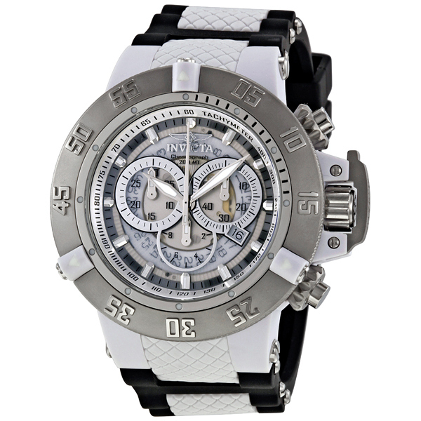 Silver-tone stainless steel case with a two-tone (white and black) plastic strap. Uni-directional rotating stainless steel bezel with a grey count-up elapsed time top ring. White dial with luminous silver-tone leaf-style shape hands and index hour markers. Minute markers. tachymeter around the outer rim. date scale around and inner ring. Dial Type: Analog. Luminescent hands and markers. Date display at the 4 o'clock position. Chronograph - three sub-dials displaying: 1/10 second, 60 second and 30 minute. Hattori Caliber VD53 quartz movement. Scratch resistant flame fusion crystal. Screw down crown. Solid case back. Round case shape, case size: 50 mm, case thickness: 18 mm. Band width: 29 mm, band length: 9 inches. Tang clasp. Water resistant at 200 meters / 660 feet. Functions: chronograph, tachymeter, date, hour, minute, second. Subaqua Series. Sport watch style. Watch label: Japan Movt. Invicta Subaqua Chronograph Mens Watch 0924.