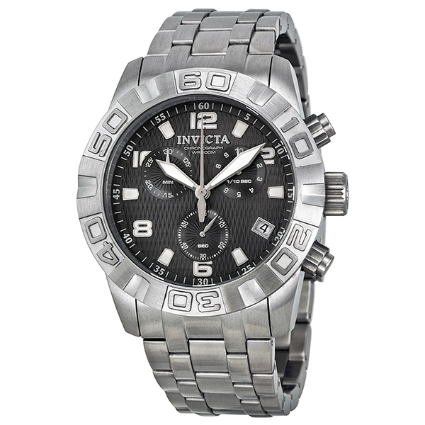 Silver-tone stainless steel case with a silver-tone stainless steel bracelet. Uni-directional rotating silver-tone stainless steel bezel. Grey dial with silver-tone hands and Arabic numeral hour markers. Minute markers around the outer rim. Dial Type: Analog. Luminescent hands and markers. Date display at the 4 o'clock position. Chronograph - three sub-dials displaying: 60 second, 30 minute and 1/10th of a second. ETA Caliber G10.211 quartz movement. Scratch resistant flame fusion crystal. Pull / push crown. Solid case back. Round case shape, case size: 45 mm, case thickness: 10 mm. Band width: 24 mm, band length: 8.5 inches. Deployment clasp. Water resistant at 100 meters / 330 feet. Functions: chronograph, date, hour, minute, second. Casual watch style. Watch label: Swiss Movt. Invicta Pro Diver Chronograph Mens Watch 11458.