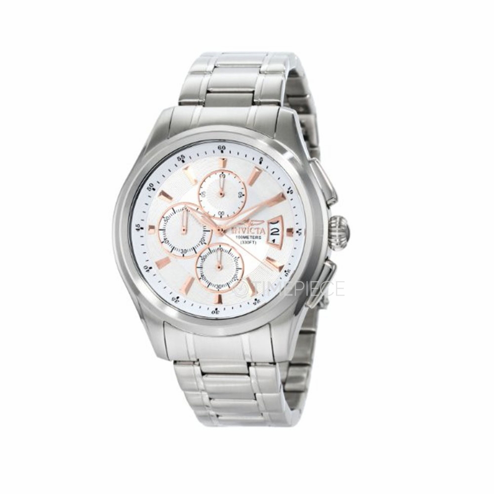 Stainless steel case with a stainless steel bracelet. Fixed stainless steel bezel. Silver-tone dial with luminous rose gold-tone hands and index hour markers. Minute markers around the outer rim. Dial Type: Analog. Luminescent hands and markers. Date display at the 3 o'clock position. Chronograph - three sub-dials displaying: 60 second, 60 minute and 1/10th of a second. Quartz movement. Scratch resistant flame fusion crystal. Pull / push crown. Solid case back. Case diameter: 45 mm. Case thickness: 13 mm. Round case shape. Band width: 22 mm. Band length: 9.5 inches. Fold-over clasp with safety release. Water resistant at 100 meters / 330 feet. Functions: chronograph, date, hour, minute, second. Casual watch style. Invicta Specialty Chronograph Silver-tone Dial Stainless Steel Mens Watch 1481.