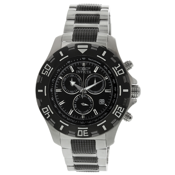 Stainless steel case with a two-tone (silver and black ion-plated) stainless steel bracelet. Uni-directional rotating black ion-plated bezel. Black dial with silver-tone hands and index hour markers. Minute markers. Tachymeter around the outer rim. Dial Type: Analog. Luminescent hands and markers. Date display at the 4 o'clock position. Chronograph - three sub-dials displaying: 60 second, 30 minute, day of the week. Quartz movement. Scratch resistant flame fusion crystal. Solid case back. Case diameter: 46 mm. Case thickness: 12 mm. Round case shape. Band width: 22 mm. Fold over clasp with a safety release. Water resistant at 100 meters / 330 feet. Functions: chronograph, date, day, hour, minute, second. Casual watch style. Invicta II Python Chronograph Mens Watch 6407.
