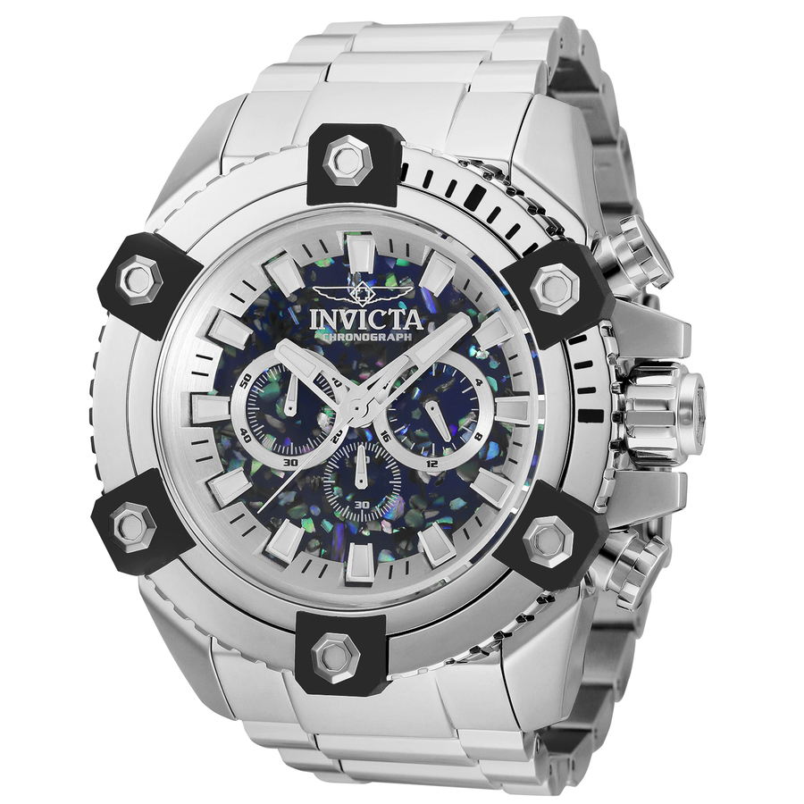 Stainless steel case with a stainless steel bracelet. Uni-directional rotating stainless steel bezel. Silver (blue abalone center) dial with luminous silver-tone hands and index hour markers. Minute markers around the outer rim. Dial Type: Analog. Luminescent hands and markers. Chronograph - three sub-dials displaying: 60 second, 60 minute and 24 hour. Hattori caliber VD53 quartz movement. Scratch resistant Flame Fusion crystal. Pull / push crown. Solid case back. Round case shape. Case size: 56 mm. Case thickness: 18 mm. Band width: 31 mm. Band length: 8.75 inches. Fold over clasp. Water resistant at 200 meters / 660 feet. Functions: chronograph, GMT, second time zone, hour, minute, second. Coalition Forces Series. Casual watch style. Watch label: Japan Movt. Invicta Coalition Forces Chronograph Quartz Blue Dial Mens Watch 35974.