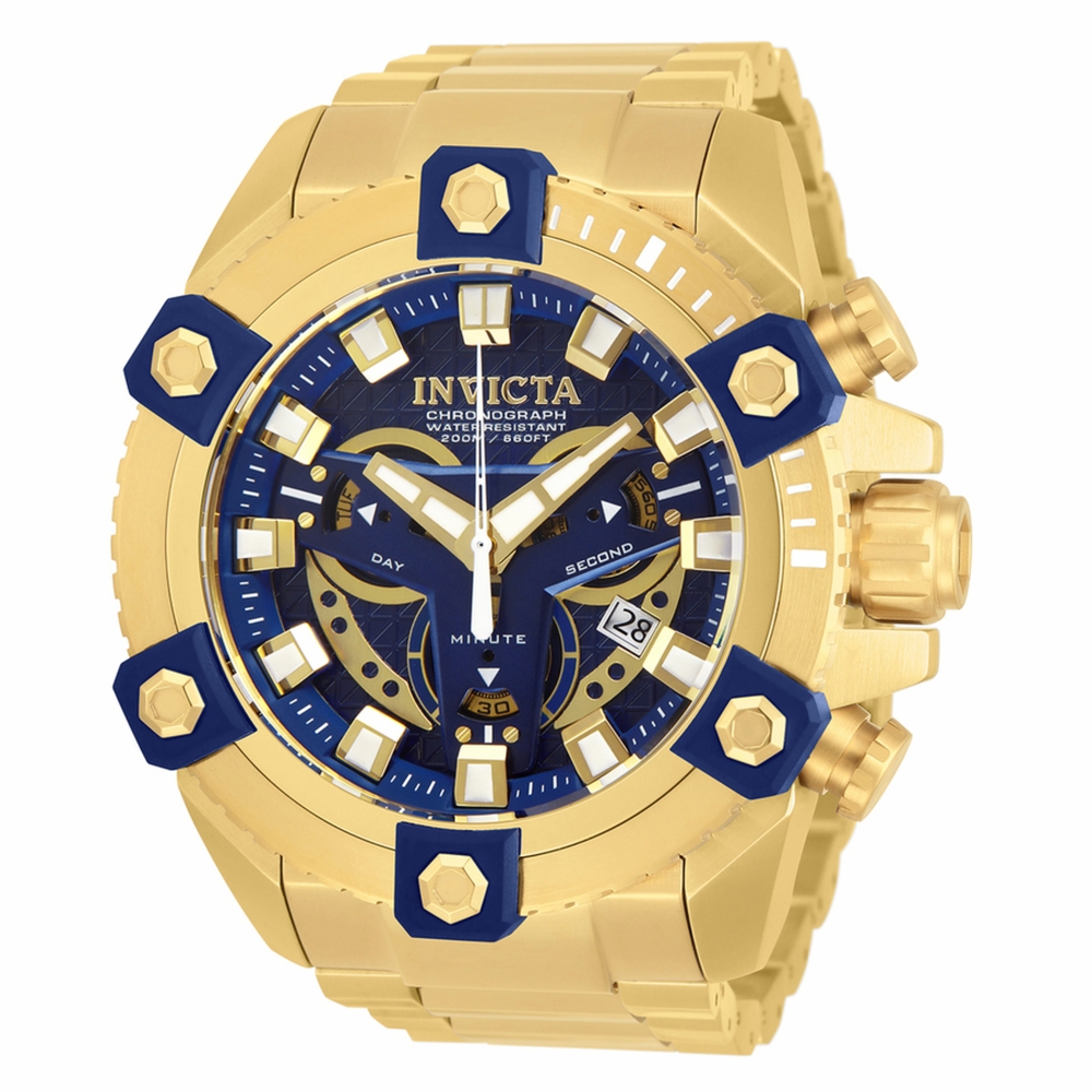Gold-tone stainless steel case and bracelet. Uni-directional rotating gold-tone stainless steel bezel. Blue dial with gold-tone hands and index hour markers. Minute markers around the outer rim. Dial Type: Analog. Luminescent hands and markers. Date display at the 4 o'clock position. Three sub-dials displaying: day, 60 second and 30 minute. Ronda Caliber Z60 quartz movement. Scratch resistant Flame Fusion crystal. Pull / push crown. Solid case back. Round case shape, case size: 56 mm, case thickness: 17 mm. Band width: 31 mm, band length: 9 inches. Fold over clasp. Water resistant at 200 meters / 660 feet. Functions: chronograph, date, day, hour, minute, small second. Coalition Forces Series. Sport watch style. Watch label: Swiss Movt. Invicta Coalition Forces Chronograph Quartz Blue Dial Mens Watch 19582.