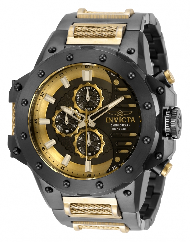 Black stainless steel case with a two-tone (black and gold-tone) stainless steel and cable bracelet. Fixed black stainless steel bezel. Two-tone (black and gold-tone) dial with gold-tone hands and index hour markers. Minute markers around the outer rim. Dial Type: Analog. Luminescent hands and markers. Chronograph - three sub-dials displaying: 60 second, 60 minute and 1/10th of a second. Hattori Caliber VD55 quartz movement. Scratch resistant Flame Fusion crystal. Pull / push crown. Solid case back. Round case shape, case size: 50 mm. Band width: 30 mm, band length: 7.25 inches. Fold over clasp. Water resistant at 100 meters / 330 feet. Functions: chronograph, hour, minute, second. Coalition Forces Series. Sport watch style. Watch label: Japan Movt. Invicta Coalition Forces Chronograph Quartz Mens Watch 32979.