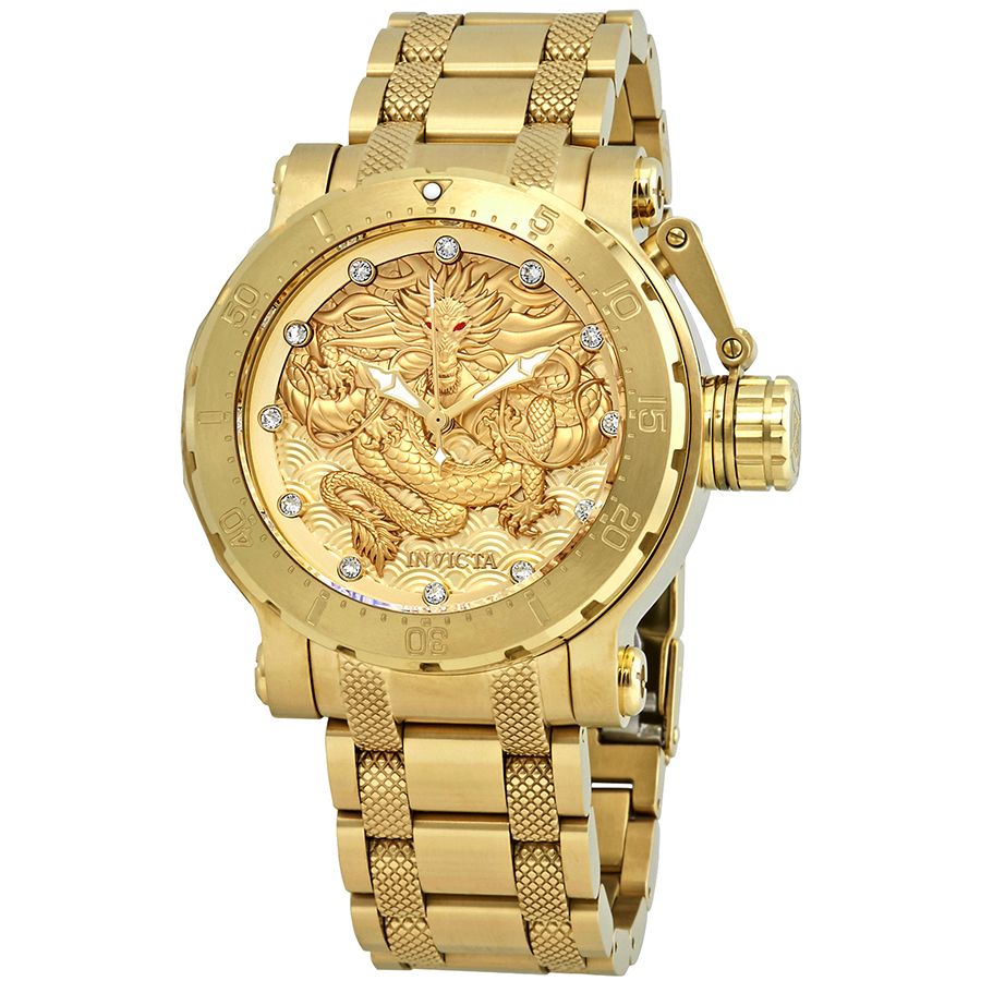 Yellow gold-tone stainless steel case with a yellow gold-tone stainless steel bracelet. Uni-directional rotating yellow gold-tone stainless steel bezel. Gold (dragon ) dial with luminous yellow gold-tone hands and crystal hour markers. Dial Type: Analog. Luminescent hands. SII Caliber NH35A automatic movement with a 41-hour power reserve. Scratch resistant flame fusion crystal. Pull / push crown. Transparent case back. Round case shape, case size: 52 mm, case thickness: 20 mm. Band width: 26 mm, band length: 9.25 inches. Fold over clasp. Water resistant at 100 meters / 330 feet. Functions: date, hour, minute, second. Casual watch style. Watch label: Japan Movt. Invicta Coalition Forces Dragon Automatic Crystal Gold Dial Mens Watch 26511.