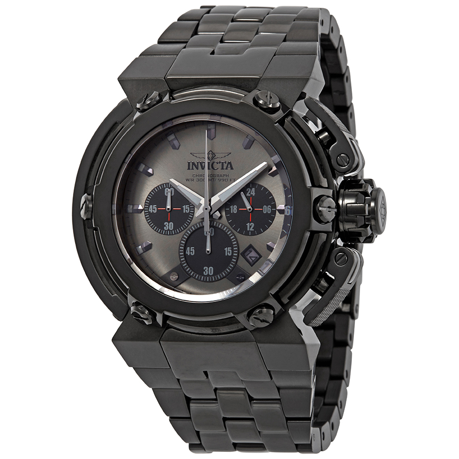 Black stainless steel case with a black stainless steel bracelet. Fixed black stainless steel bezel. Black dial with silver-tone hands and index hour markers. Dial Type: Analog. Date display between 4 and 5 o'clock position. Chronograph - three sub-dials displaying: 60 second, 60 minute and 24 hour. Hattori Caliber VD53 quartz movement. Scratch resistant mineral crystal. Screw down crown. Solid case back. Round case shape, case size: 46 mm, case thickness: 18 mm. Band width: 35.7 mm, band length: 8 inches. Fold over clasp. Water resistant at 300 meters / 1000 feet. Functions: chronograph, date, hour, minute, second. Dive watch style. Watch label: Japan Movt. Invicta Coalition Forces Chronograph Black Dial Mens Watch 26576.