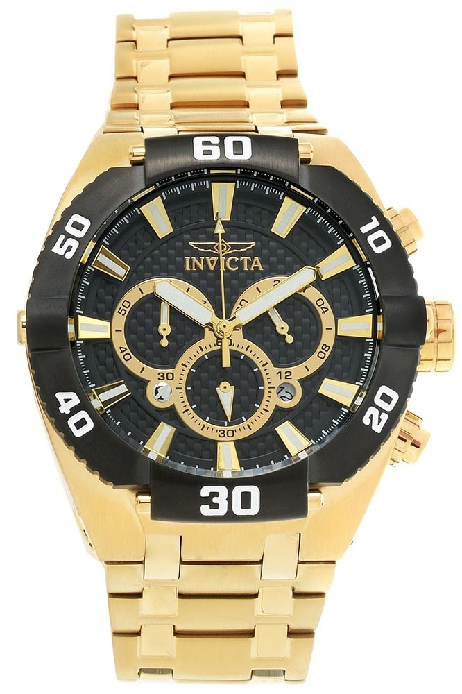 Yellow gold-tone stainless steel case and bracelet. Fixed black-plated bezel. Black dial with luminous yellow gold-tone hands and index hour markers. Minute markers around the outer rim. Dial Type: Analog. Luminescent hands and markers. Date display between the 4 and 5 o'clock positions. Chronograph - three sub-dials displaying: 60 second, 60 minute and 24 hour. Hattori caliber VD53 quartz movement. Scratch resistant flame fusion crystal. Pull / push crown. Solid case back. Round case shape. Case size: 50 mm. Case thickness: 18 mm. Band width: 30 mm. Band length: 8 inches. Fold over clasp. Water resistant at 100 meters / 330 feet. Functions: chronograph, date, GMT, second time zone, hour, minute, second. Coalition Forces Series. Sport watch style. Watch label: Japan Movt. Invicta Coalition Forces Chronograph Black Dial Mens Watch 27257.