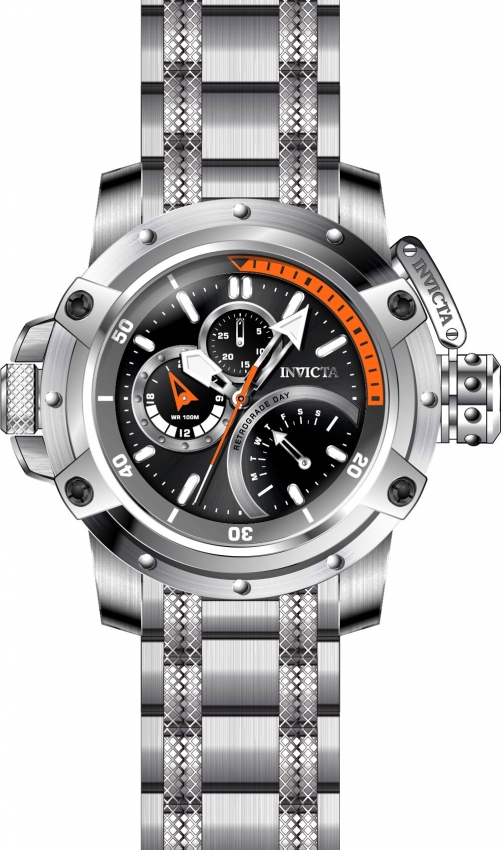 Stainless steel case and bracelet. Uni-directional rotating stainless steel bezel. Black dial with silver-tone arrow-shaped hands and index hour markers. Minute markers around the outer rim. Dial Type: Analog. Luminescent hands and markers. Two sub-dials displaying: date and 24 hour. Retrograde day of the week display. Miyota Caliber JR00 quartz movement. Scratch resistant Flame Fusion crystal. Screw down crown. Solid case back. Round case shape. Case size: 52.5 mm. Case thickness: 14 mm. Band width: 26 mm. Band length: 7.25 inches. Fold over clasp with a safety release. Water resistant at 100 meters / 330 feet. Functions: chronograph, retrograde, date, day, GMT, minute, second. Coalition Forces Series. Military watch style. Watch label: Japan Movt. Invicta Coalition Forces Chronograph Quartz Mens Watch 30378.