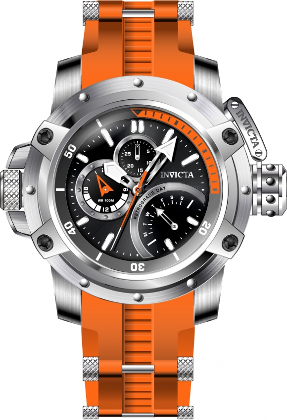 Silver-tone stainless steel case with a orange silicone with stainless steel inserts strap. Fixed outer, bidirectional rotating inner silver-tone and black stainless steel bezel. Black dial with silver-tone skeleton arrow-shaped hands and index hour markers. Minute markers around the outer rim. Dial Type: Analog. Luminescent hands and markers. Date display at the 12 o'clock position. Three - date, retrograde day of the week and 24 hour subdials. Miyota Caliber JR00 quartz movement. Scratch resistant flame fusion crystal. Screw down crown. Solid case back. Round case shape, case size: 52.5 mm, case thickness: 14 mm. Band width: 26 mm, band length: 7.25 inches. Tang clasp. Water resistant at 100 meters / 330 feet. Functions: retrograde, date, day, GMT, minute, second. Coalition Forces Series. Sport watch style. Watch label: Japan Movt. Invicta Coalition Forces Quartz Mens Watch 30384.