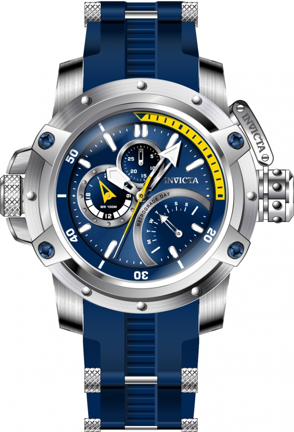 Stainless steel case with a blue silicone strap with stainless steel barrel inserts. Fixed stainless steel bezel. Blue dial with luminous silver-tone hands and index hour markers. Minute markers around the outer rim. Dial Type: Analog. Luminescent hands and markers. Two sub-dials displaying: date and 24 hours. Retrograde day of the week display. Miyota caliber JR00 quartz movement. Scratch resistant Flame Fusion crystal. Screw down crown. Solid case back. Round case shape. Case size: 52.5 mm. Case thickness: 14 mm. Band width: 26 mm. Band length: 7.25 inches. Tang clasp. Water resistant at 100 meters / 330 feet. Functions: retrograde, date, day, GMT, minute, second. Coalition Forces Series. Sport watch style. Watch label: Japan Movt. Invicta Coalition Forces Quartz Blue Dial Mens Watch 30385.