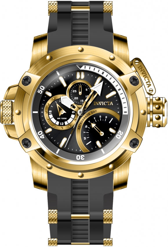 Yellow gold-tone stainless steel case with a black silicone strap with yellow gold-tone barrel inserts. Fixed yellow gold-tone bezel. Black dial with luminous yellow gold-tone hands and index hour markers. Minute markers around the outer rim. Dial Type: Analog. Luminescent hands and markers. Two sub-dials displaying: date and 24 hour. Retrograde day of the week display. Miyota caliber JR00 quartz movement. Scratch resistant Flame Fusion crystal. Screw down crown. Solid case back. Round case shape. Case size: 52.5 mm. Case thickness: 14 mm. Band width: 26 mm, band length: 7.25 inches. Tang clasp. Water resistant at 100 meters / 330 feet. Functions: retrograde, date, day, GMT, minute, second. Coalition Forces Series. Sport watch style. Watch label: Japan Movt. Invicta Coalition Forces Quartz Black Dial Mens Watch 30389.