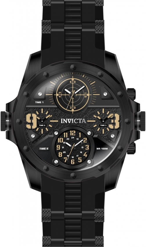Black stainless steel case with a black stainless steel and silicone strap. Fixed black stainless steel bezel. Black dial with Arabic numeral and index hour markers. Dial Type: Analog. Luminescent hands and markers. Four time zone subdials. Miyota Caliber 2035 quartz movement. Scratch resistant flame fusion crystal. Pull / push crown. Solid case back. Round case shape, case size: 50 mm, case thickness: 13 mm. Band width: 26 mm, band length: 7.75 inches. Pin buckle clasp. Water resistant at 50 meters / 165 feet. Functions: hour, minute, second, 4 time zone. Casual watch style. Watch label: Japan Movt. Invicta Coalition Forces Quartz Black Dial Mens Watch 31140.