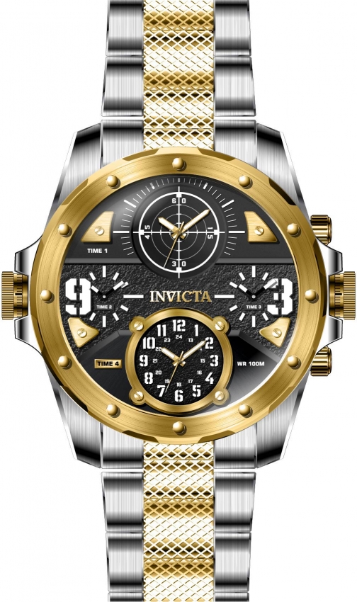 Stainless steel case with a two-tone (silver-tone and gold-tone) stainless steel bracelet. Fixed gold-tone bezel. Black (four time zone) dial with luminous gold-tone hands. Dial Type: Analog. Luminescent hands and markers. Miyota caliber 2035, Miyota caliber 2025 quartz movement. Scratch resistant Flame Fusion crystal. Pull / push crown. Solid case back. Round case shape. Case size: 50 mm. Case thickness: 13 mm. Band width: 26 mm. Band length: 7.75 inches. Fold over clasp. Water resistant at 50 meters / 165 feet. Functions: hour, minute, second, four time zone. Coalition Forces Series. Military watch style. Watch label: Japan Movt. Invicta Coalition Forces Quartz Black Four Time Zone Dial Mens Watch 31148.