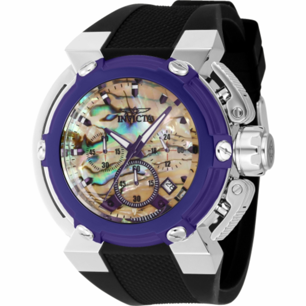 Silver-tone and purple stainless steel case with a black silicone strap. Fixed two-tone (silver-tone and purple) stainless steel bezel. Purple and white dial with purple hands and index hour markers. Minute markers around the outer rim. Dial Type: Analog. Luminescent hands and markers. Date display at the 4 o'clock position. Chronograph - three sub-dials displaying: 60 second, 60 minute and 24 hour. Hattori Caliber VD53 quartz movement. Scratch resistant mineral crystal. Screw down crown. Solid case back. Round case shape, case size: 46 mm, case thickness: 17.2 mm. Band width: 35.7 mm, band length: 8.25 inches. Buckle clasp. Water resistant at 300 meters / 1000 feet. Functions: chronograph, date, GMT, second time zone, hour, minute, second. Coalition Forces Series. Dive watch style. Watch label: Japan Movt. Invicta Coalition Forces X-Wing Chronograph Quartz Mens Watch 40063.