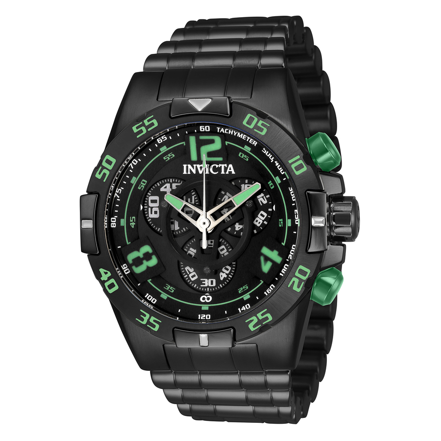 Black-plated stainless steel case and bracelet. Fixed black-plated bezel. Black dial with luminous green hands and index hour markers. Arabic numerals appear at the 4, 8 and 12 o'clock positions. Minute markers. Arabic numeral minute markers (at 5 minute intervals). Tachymeter markings around the outer rim. Dial Type: Analog. Luminescent hands and markers. Chronograph - two sub-dials displaying: 24 hour and 60 minute. Day of the week sub-dial. SII caliber VK68A quartz movement. Scratch resistant Flame Fusion crystal. Pull / push crown. Solid case back. Round case shape. Case size: 47 mm. Case thickness: 15 mm. Band width: 28 mm. Band length: 8.50 inches. Fold over clasp. Water resistant at 100 meters / 330 feet. Functions: chronograph, date, GMT, second time zone, hour, minute, second. Corduba Series. Casual watch style. Watch label: Japan Movt. Invicta Corduba Black Dial Mens Watch 34984.