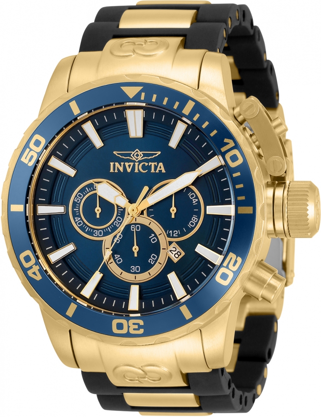 Gold-tone stainless steel case with a two-tone (black and gold-tone) stainless steel and polyurethane strap. Uni-directional rotating blue and gold stainless steel bezel. Blue dial with gold-tone hands and index hour markers. Minute markers around the outer rim. Dial Type: Analog. Luminescent hands and markers. Date display between 4 and 5 o'clock position. Chronograph - three sub-dials displaying: 60 second, 60 minute and 24 hour. Hattori Caliber VD53 quartz movement. Scratch resistant Flame Fusion crystal. Pull / push crown. Solid case back. Round case shape, case size: 52 mm, case thickness: 15.6 mm. Band width: 28 mm, band length: 7.25 inches. Buckle clasp. Water resistant at 200 meters / 660 feet. Functions: chronograph, date, GMT, second time zone, hour, minute, second. Corduba Series. Sport watch style. Watch label: Japan Movt. Invicta Corduba Chronograph Quartz Blue Dial Mens Watch 33694.