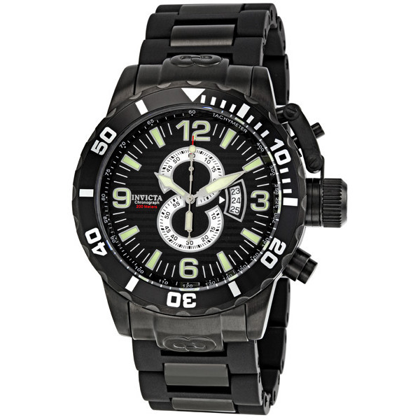 Black ion-plated stainless steel case with a black ion-plated stainless steel bracelet with black rubber center links. Unidirectional black ion-plated bezel. Black dial with luminous hands and stick hour markers. Arabic numerals mark the 3, 6, 9 and 12 o'clock positions. Minute markers. Tachymeter scale around the outer rim. Luminescent hands and markers. Date display appears near the 3 o'clock position. Chronograph - two sub-dials displaying: 60 second and 60 minute. Quartz movement. Scratch resistant mineral crystal. Screw down crown with protective cap. Solid case back. Case diameter: 52 mm. Case thickness: 15 mm. Deployment clasp with push button release. Water resistant at 200 meters / 660 feet. Invicta Corduba Diver Chronograph Black Dial Black PVD Stainless Steel Mens Watch 4902.