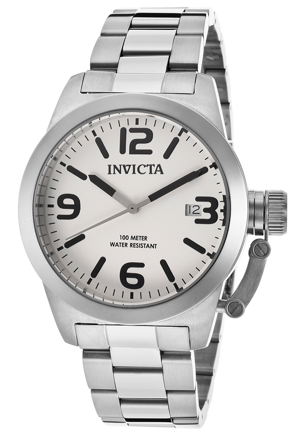 Silver-tone stainless steel case with a silver-tone stainless steel bracelet. Fixed silver-tone stainless steel bezel. Silver-tone dial with black hands and Arabic numeral and index hour markers. Minute markers around the outer rim. Dial Type: Analog. Date display at the 3 o'clock position. Ronda Caliber 515 quartz movement. Scratch resistant mineral crystal. Pull / push crown. Solid case back. Round case shape, case size: 40 mm, case thickness: 12 mm. Band length: 9 inches. Water resistant at 100 meters / 330 feet. Functions: date, hour, minute, second. Casual watch style. Watch label: Swiss Movt. Invicta Corduba Silver Dial Mens Watch 14826.