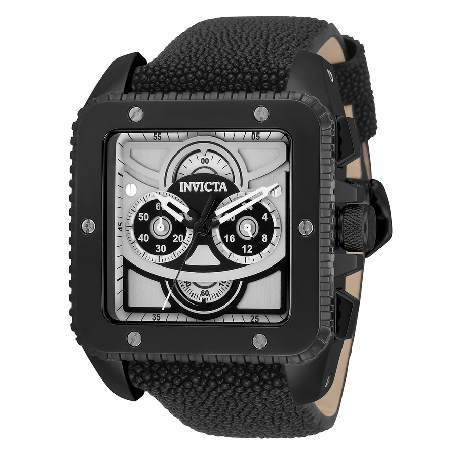 Black and silver-tone stainless steel case with a black genuine stingray band. Fixed black stainless steel bezel. Black and silver dial with silver-tone hands and index hour markers. Minute markers around the outer rim. Dial Type: Analog. Chronograph - four sub-dials displaying: 60 second, 30 minute and 1/10th of a second, 24 hour. Hattori Caliber VD56 quartz movement. Scratch resistant Flame Fusion crystal. Pull / push crown. Solid case back. Square case shape, case size: 45 mm, case thickness: 14.5 mm. Band width: 28 mm, band length: 7.75 inches. Buckle clasp. Water resistant at 50 meters / 165 feet. Functions: chronograph, GMT, second time zone, hour, minute, second. Cuadro Series. Sport watch style. Watch label: Japan Movt. Invicta Cuadro Chronograph Quartz Mens Watch 31998.