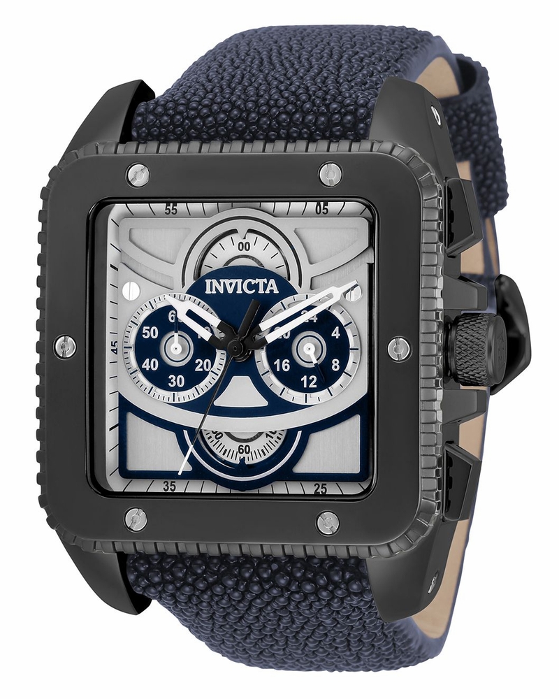 Gunmetal stainless steel case with a blue genuine stingray band. Fixed stainless steel bezel. Silver dial with skeleton white hands. Minute markers around the outer rim. Dial Type: Analog. Chronograph - four sub-dials displaying: 60 second, 30 minute and 1/10th of a second, 24 hour. Hattori Caliber VD56 quartz movement. Scratch resistant Flame Fusion crystal. Pull / push crown. Solid case back. Square case shape, case size: 45 mm. Buckle clasp. Water resistant at 50 meters / 165 feet. Functions: chronograph, GMT, second time zone, hour, minute, second. Cuadro Series. Sport watch style. Watch label: Japan Movt. Invicta Cuadro Chronograph Quartz Mens Watch 32000.
