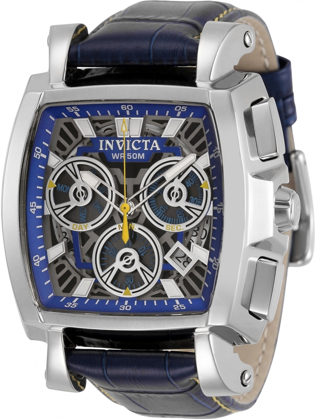 Silver-tone stainless steel case with a blue leather strap. Fixed silver-tone stainless steel bezel. Black, gunmetal and metallic blue dial with silver-tone hands and index hour markers. Minute markers around the outer rim. Dial Type: Analog. Luminescent hands and markers. Date display between 4 and 5 o'clock position. Three sub-dials displaying: day, 60 second and 30 minute. Ronda Caliber Z60 quartz movement. Scratch resistant Flame Fusion crystal. Pull / push crown. Solid case back. Cushion case shape, case size: 48 mm, case thickness: 14.5 mm. Band width: 22 mm, band length: 8.75 inches. Buckle clasp. Water resistant at 50 meters / 165 feet. Functions: chronograph, date, day, hour, minute, small second. Cuadro Series. Sport watch style. Watch label: Swiss Movt. Invicta Cuadro Chronograph Quartz Mens Watch 32162.