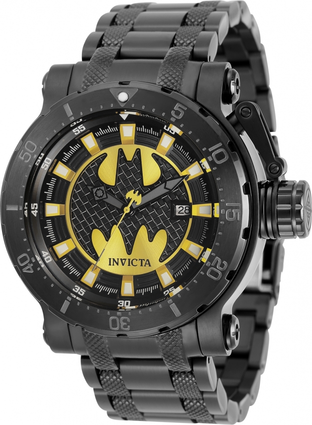 32193 DC Comics Batman Invicta Watch. Black stainless steel case and bracelet. Uni-directional rotating black and gunmetal stainless steel bezel. Black and yellow dial with black hands and index hour markers. Minute markers around the outer rim. Dial Type: Analog. Luminescent hands and markers. Date display at the 3 o'clock position. TMI Caliber NH35 Automatic movement, containing 24 Jewels, bitting at 21600 vph, and has a power reserve of approximately 41 hours. Scratch resistant Flame Fusion crystal. Screw down crown. Transparent see through case back. Round case shape, case size: 52 mm, case thickness: 19.5 mm. Band width: 26 mm, band length: 7.75 inches. Fold over clasp. Water resistant at 100 meters / 330 feet. Functions: date, hour, minute, second. Dc Comics Series. Casual watch style. Watch label: Japan Movt. Invicta DC Comics Batman Automatic Mens Watch 32193.