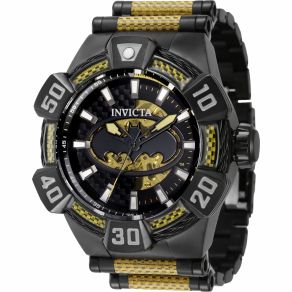 Black stainless steel case with a two-tone (yellow and black) glass fiber and stainless steel bracelet. Fixed three-tone (yellow and gunmetal and black) cable and glass fiber and stainless steel bezel. Yellow and black dial with blue hands and index hour markers. Minute markers around the outer rim. Dial Type: Analog. Luminescent hands and markers. Caliber JSD-006ZY automatic movement. Scratch resistant Flame Fusion crystal. Pull / push crown. Transparent see through case back. Round case shape, case size: 52 mm. Band width: 32 mm, band length: 7.50 inches. Fold over safety clasp. Water resistant at 100 meters / 330 feet. Functions: hour, minute, second. Dc Comics Series. Casual watch style. Invicta DC Comics Batman Automatic Mens Watch 40982.