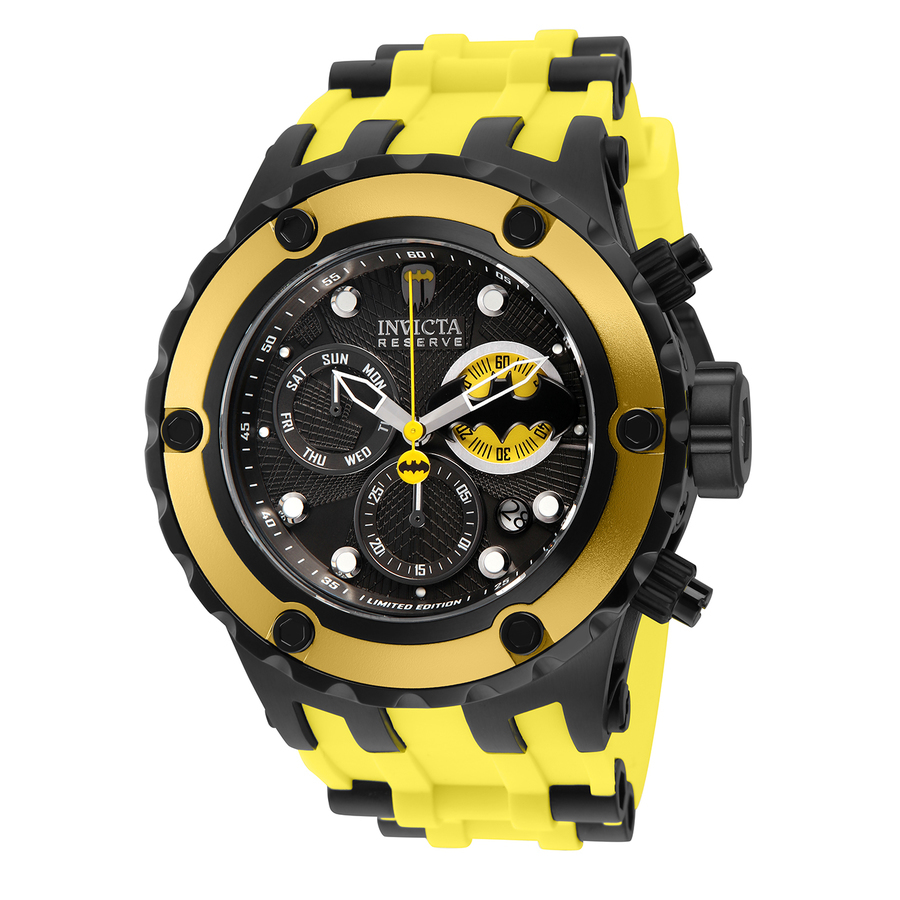 Dive watch style. Watch label: Swiss Movt. Invicta DC Comics Batman Black Dial Mens Watch 32787.