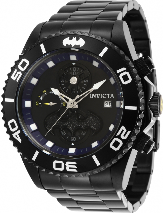 Black stainless steel case and bracelet. Uni-directional rotating black stainless steel bezel. Black dial with silver-tone hands and index hour markers. Minute markers around the outer rim. Dial Type: Analog. Luminescent hands and markers. Date display at the 3 o'clock position. Chronograph - three sub-dials displaying: 60 second, 60 minute and 1/10th of a second. Hattori Caliber VD57 quartz movement. Scratch resistant Flame Fusion crystal. Pull / push crown. Solid case back. Round case shape, case size: 47 mm, case thickness: 18 mm. Band width: 24 mm, band length: 8.50 inches. Fold over clasp. Water resistant at 200 meters / 660 feet. Functions: chronograph, date, hour, minute, second. Dc Comics Series. Sport watch style. Watch label: Japan Movt. Invicta DC Comics Batman Chronograph Quartz Black Dial Mens Watch 34626.