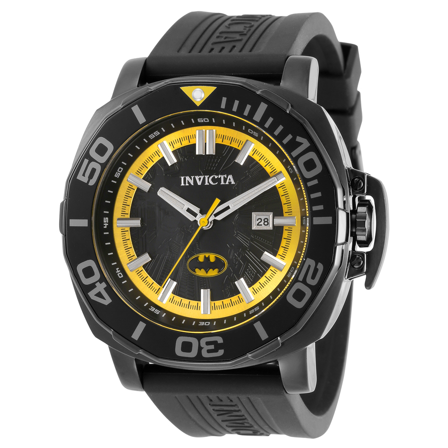 Black stainless steel case with a black silicone strap. Uni-directional rotating black and grey stainless steel bezel. Black dial with silver-tone hands and index hour markers. Minute markers around the outer rim. Dial Type: Analog. Luminescent hands and markers. Date display at the 3 o'clock position. Hattori Caliber PC32 quartz movement. Scratch resistant Flame Fusion crystal. Pull / push crown. Solid case back. Round case shape, case size: 48 mm, case thickness: 14.2 mm. Band width: 26 mm, band length: 8.75 inches. Buckle clasp. Water resistant at 100 meters / 330 feet. Functions: date, hour, minute, second. Dc Comics Series. With the creation of the elegant businessman Bruce Wayne and his secret identity in 1939 Gotham City along with the world of comics has never been the same. Batman is one of the most identifiable characters of all time and a true cultural icon. The oath he took for vengeance following the brutal death of his parents as a child is tempered by a clear sense of honor and ethical justice. However Batman's struggle with an internal darkness is reflected throughout his bat-inspired persona. Unlike most superheroes Batman does not possess any superpowers and this Dark Knight instead relies on his intellect ingenuity physical skill science and technology along with his formidable will. Send up the Bat Signal the Caped Crusader's presence is required. Casual watch style. Watch label: Japan Movt. Invicta DC Comics Batman Quartz Black Dial Mens Watch 35079.
