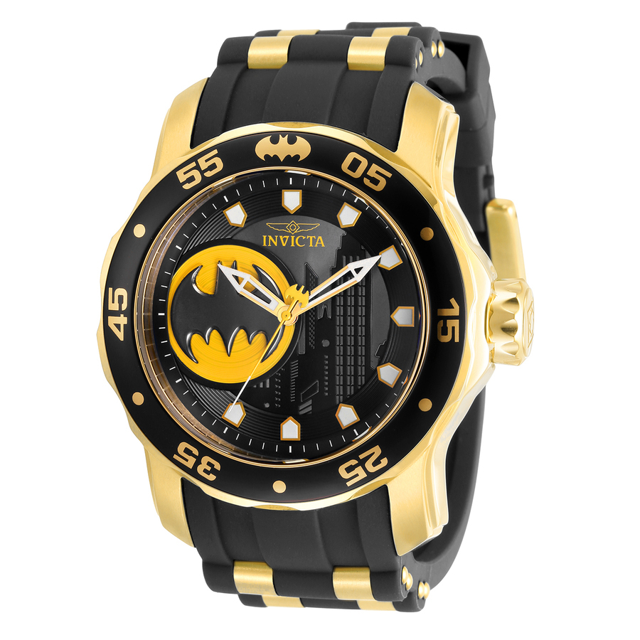 With the creation of the elegant businessman Bruce Wayne and his secret identity in 1939 Gotham City along with the world of comics has never been the same. Batman is one of the most identifiable characters of all time and a true cultural icon. The oath he took for vengeance following the brutal death of his parents as a child is tempered by a clear sense of honor and ethical justice. However Batman?s struggle with an internal darkness is reflected throughout his bat-inspired persona. Unlike most superheroes Batman does not possess any superpowers and this Dark Knight instead relies on his intellect ingenuity physical skill science and technology along with his formidable will. Send up the Bat Signal the Caped Crusader's presence is required. Gold-tone stainless steel case with a two-tone (black and gold-tone) silicone and stainless steel strap. Uni-directional rotating two-tone (black and gold-tone) stainless steel bezel. Gold and black and white dial with gold-tone hands and index hour markers. Minute markers around the outer rim. Dial Type: Analog. Luminescent hands and markers. Hattori Caliber PC21AF quartz movement. Scratch resistant Flame Fusion crystal. Pull / push crown. Solid case back. Round case shape, case size: 48 mm. Band width: 26 mm, band length: 8.25 inches. Buckle clasp. Water resistant at 100 meters / 330 feet. Functions: hour, minute, second. Dc Comics Series. Casual watch style. Watch label: Japan Movt. Invicta DC Comics Batman Quartz Mens Watch 34752.