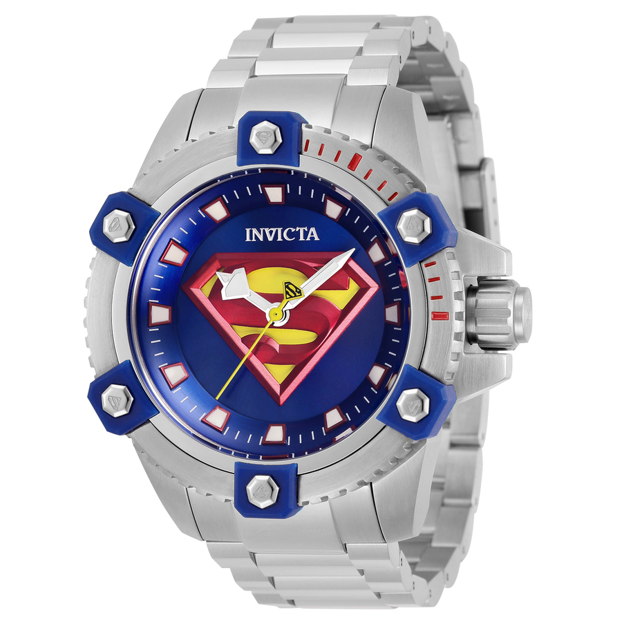 Stainless steel case with a stainless steel bracelet. Uni-directional rotating stainless steel bezel. Blue (Superman) dial with luminous silver-tone hands and index hour markers. Minute markers around the outer rim. Dial Type: Analog. Luminescent hands and markers. Caliber Y121F2 quartz movement. Scratch resistant Flame Fusion crystal. Pull / push crown. Solid case back. Round case shape. Case size: 48 mm. Case thickness: 16 mm. Band width: 24 mm. Band length: 8.25 inches. Fold over clasp. Water resistant at 100 meters / 330 feet. Functions: hour, minute, second. Dc Comics Series. Casual watch style. Invicta DC Comics Superman Blue Dial Mens Watch 32488.